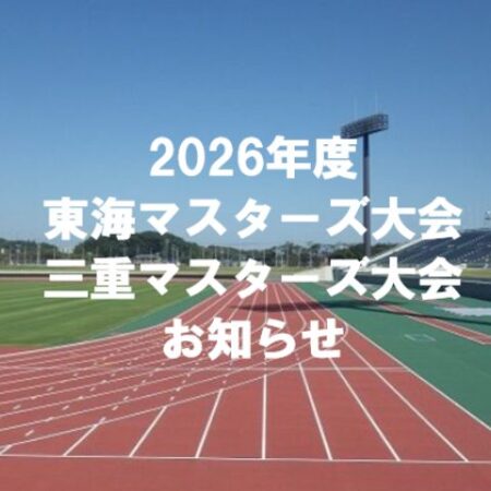 SPECIAL 特集 東海・三重マスターズ陸上選手権大会のお知らせ 第25回東海マスターズ陸上競技選手権大会 兼 第31回三重マスターズ陸上競技選手権大会 大会 開催日:2026年5月17日(日) 「大会要項」のご確認 ⇒ こちら ◆本大会の参加申込受付についてお知らせします。 エントリーリストを掲載します。 参加申込者は、氏名、所属、クラス、出場種目等、エントリーリストに誤りがないかご確認ください。 参加申込者エントリーリスト ⇒ こちら エントリーリストに誤りがあれば、早急に<4/27(月)までに>「大会要項」に記載した問い合せ先までご連絡ください。
