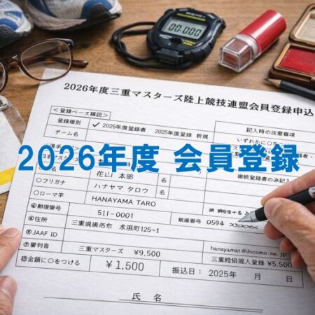 ・登録申込書は、下記に掲載した「2026年度三重マスターズ陸上競技連盟会員登録申込書」をご確認ください。